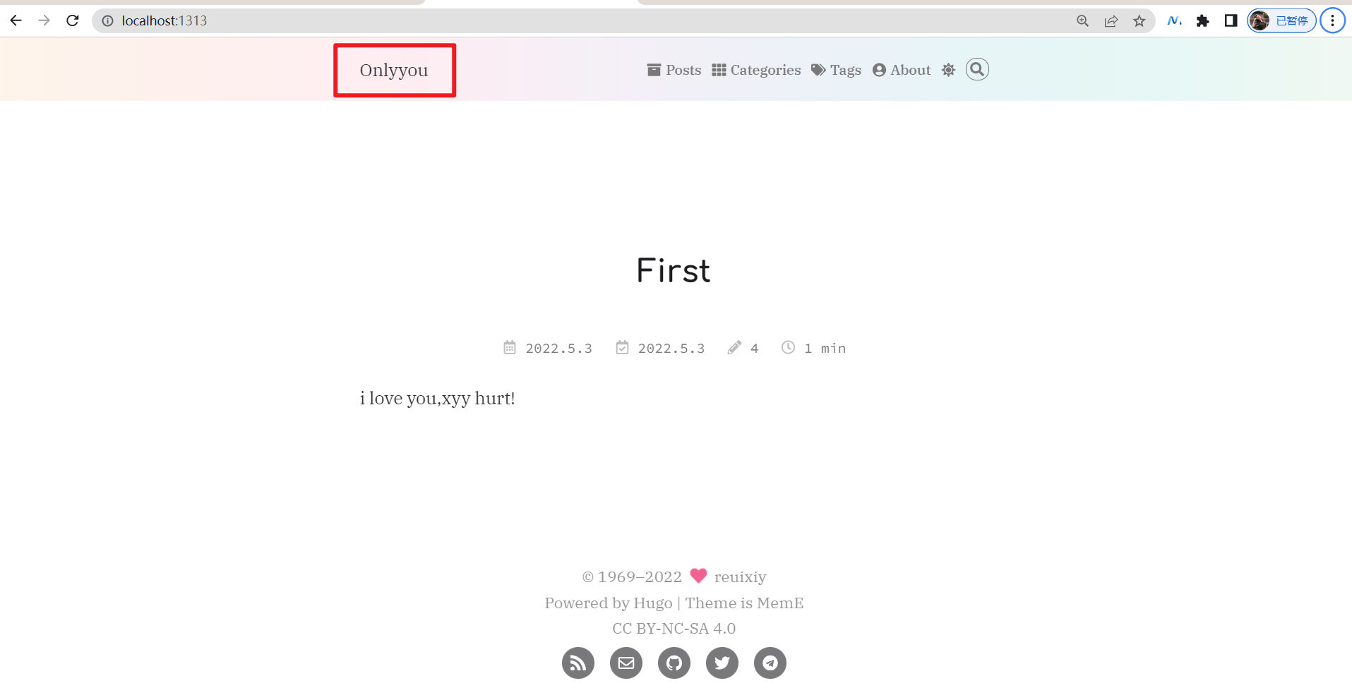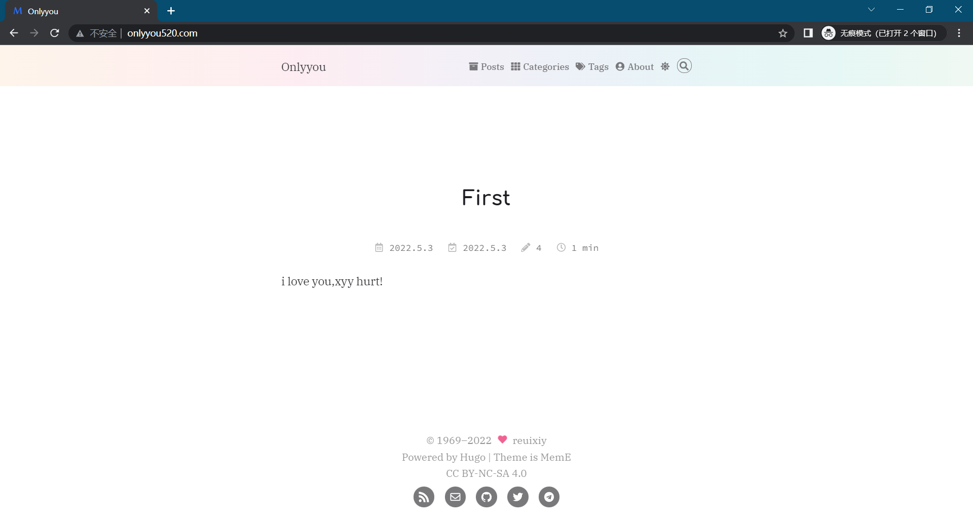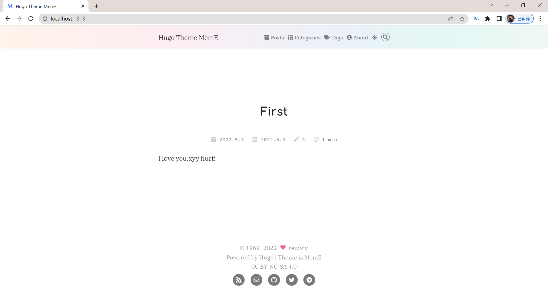 $ echo "i love you,xyy hurt!" >> content/post/first.md