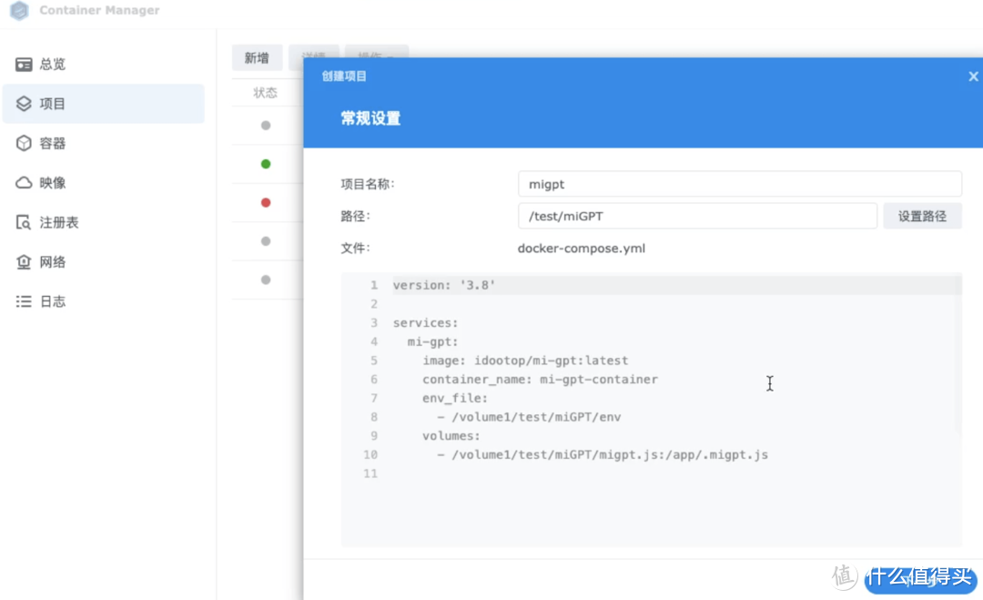 接下来以群晖演示部署MIGPT。 🔻 首先准备好 docker-compose.yml 文件。/volume1/test/miGPT/要修改为配置文件夹的路径。