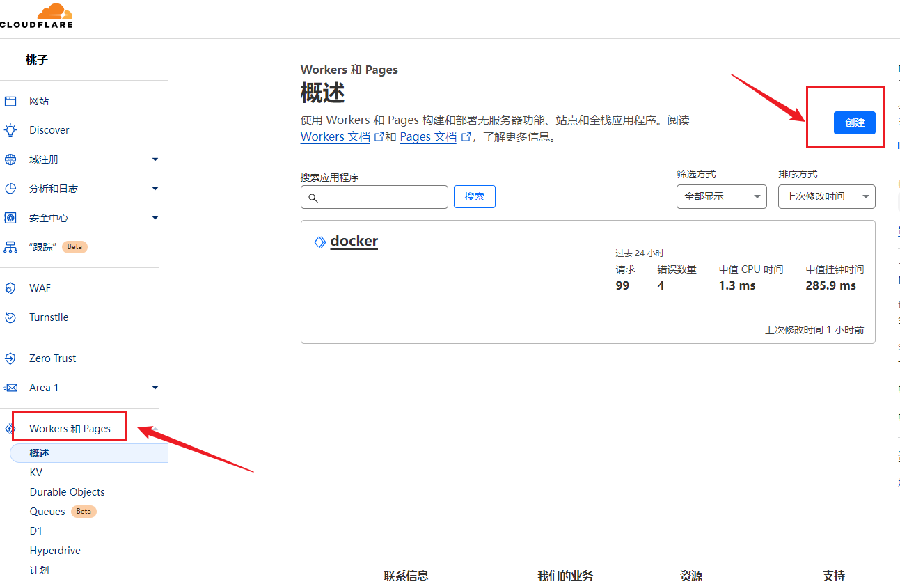 在左侧 workers and pages,然后新建,名字随便起。没有过多的配置,直接完成!