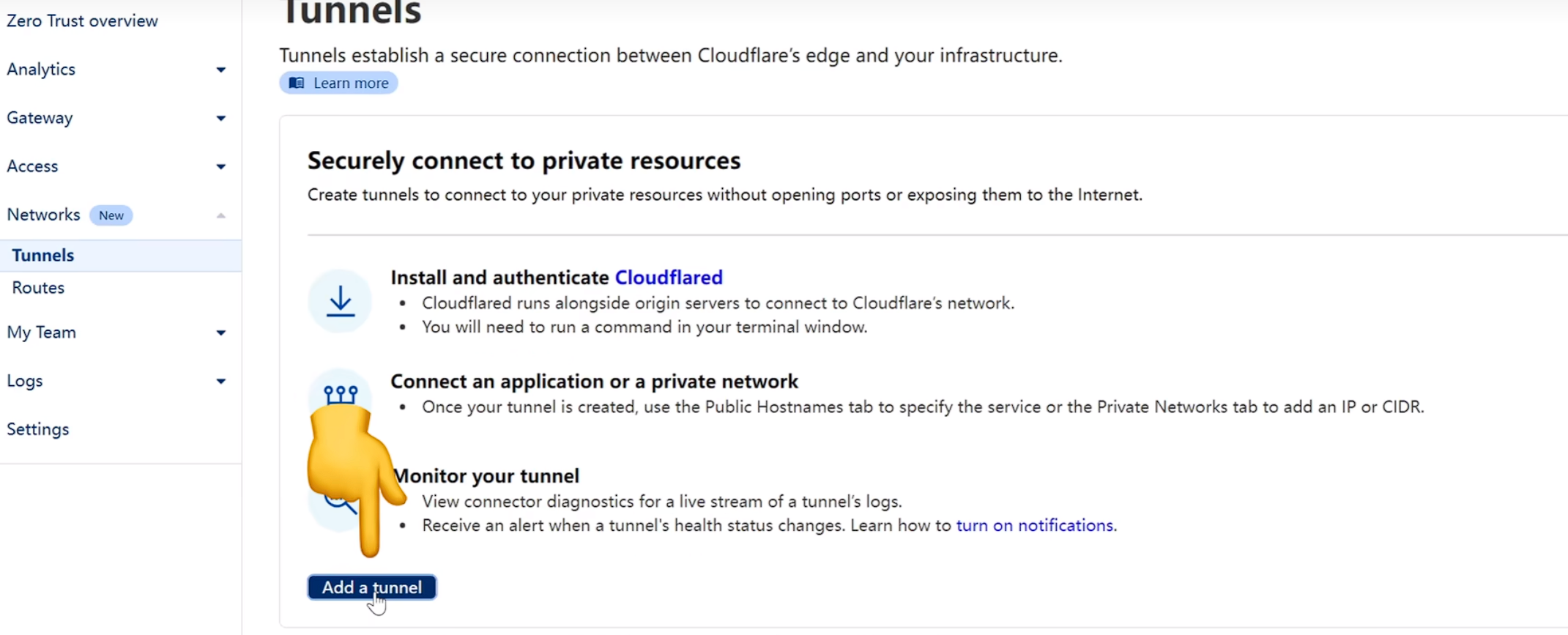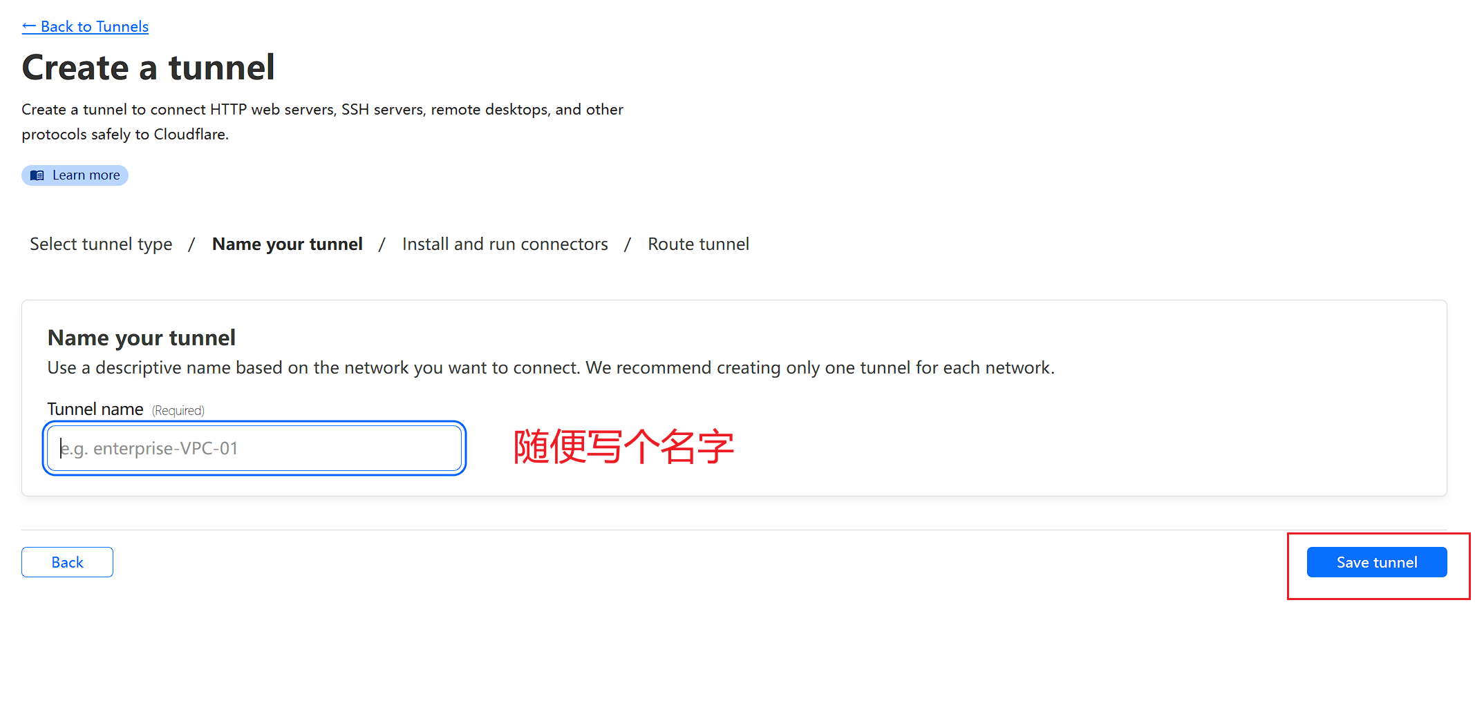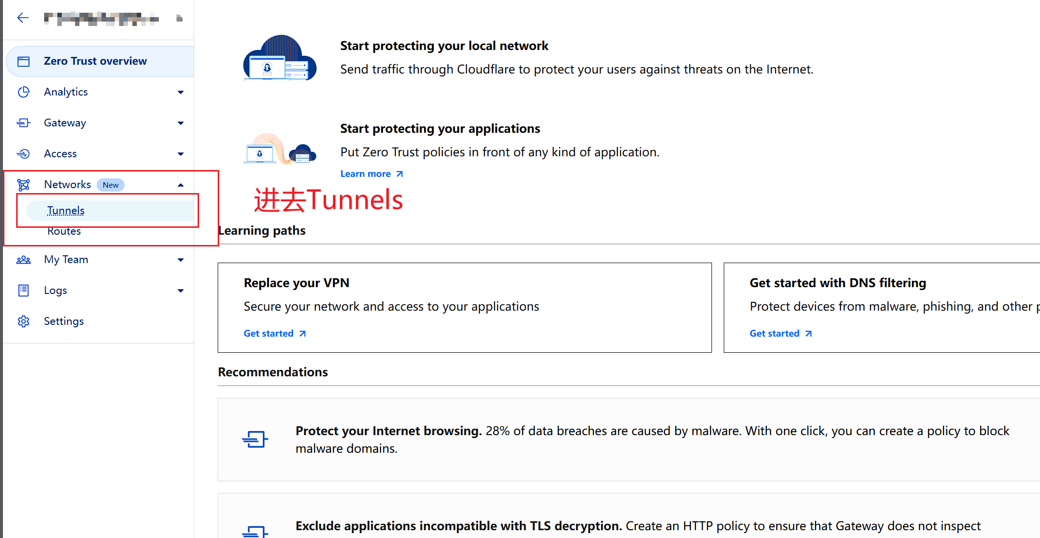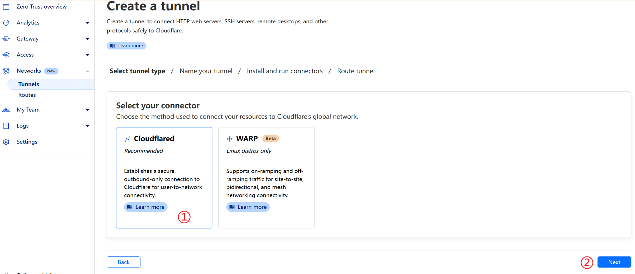 - 建隧道:在CloudFlare上创建一个隧道(CloudFlare本质上给我们提供了一个公网IP地址和服务器,但是需要配置隧道连接);