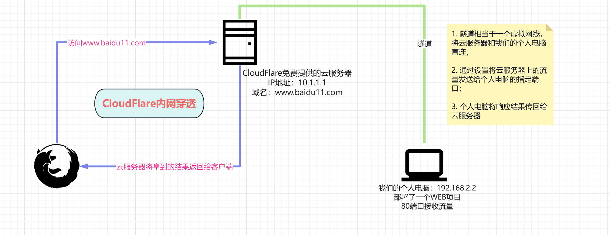 - 连隧道:下载CloudFlare提供的隧道客户端,并在本地通过客户端连接上CloudFlare提供的服务器(相当于通过一根虚拟网线,将我们的电脑与云服务器直连了)。