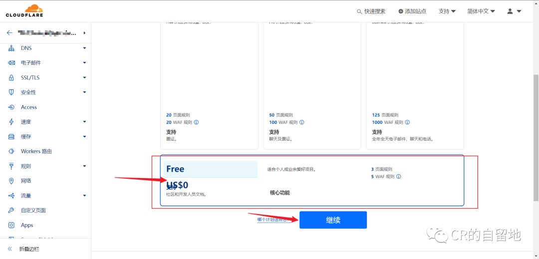 步骤一:下拉选择Free计划,点击继续