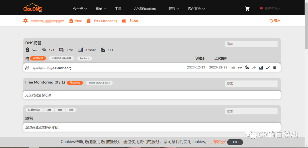 注册好一个ClouDNS账号并注册域名,见教程教你免费注册一个ClouDNS永久域名(保姆级教程)