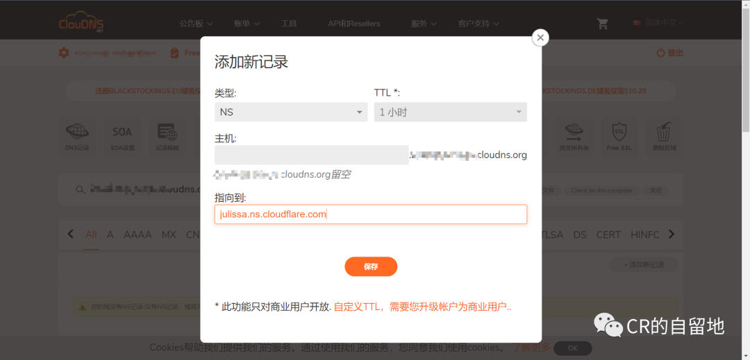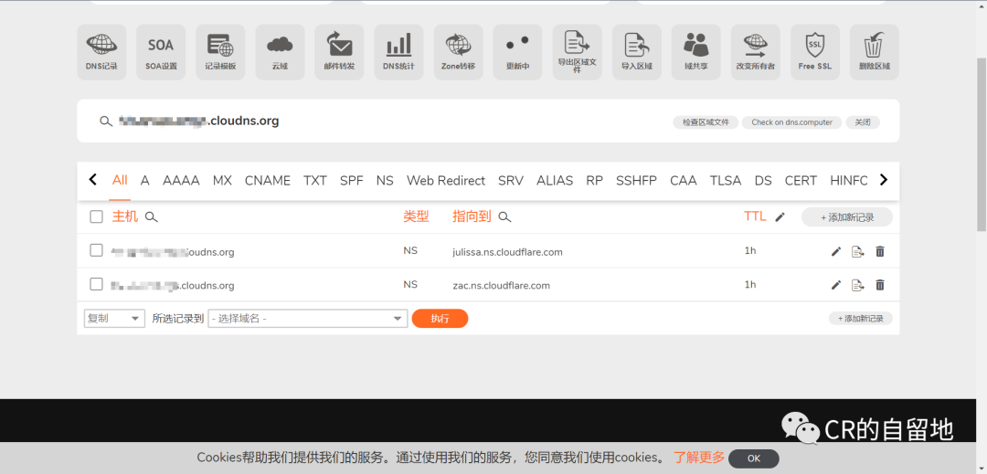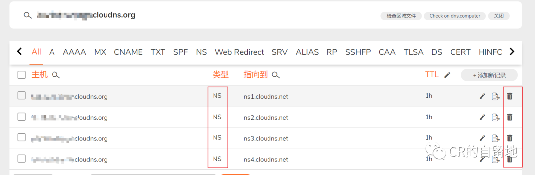 切换到cloudns,它的NS记录已经在之前的操作中删除了,点击添加新记录