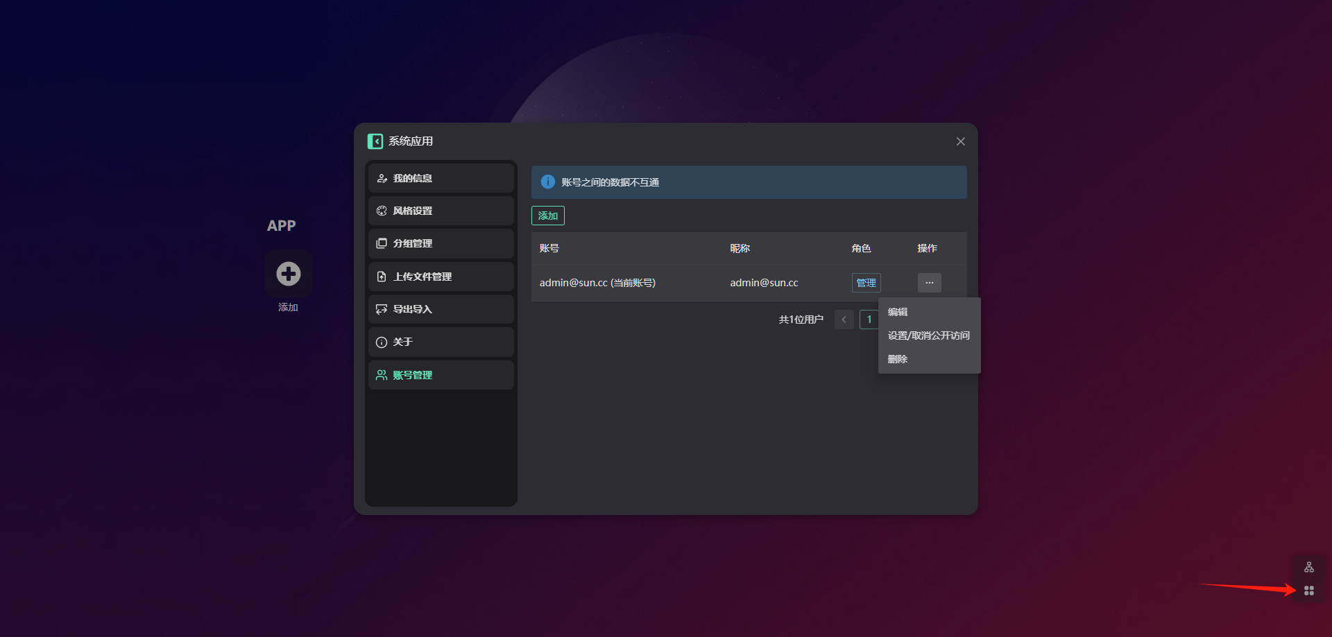 右下角进入 设置 –> 账号管理,可以编辑、修改、删除等操作,建议用自己的账号,并取消默认账号的权限