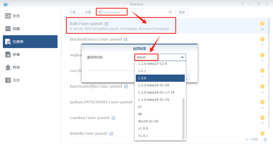 在注册表中搜索 sun-panel ,选择第一个 hslr/sun-panel,版本选择 latest。