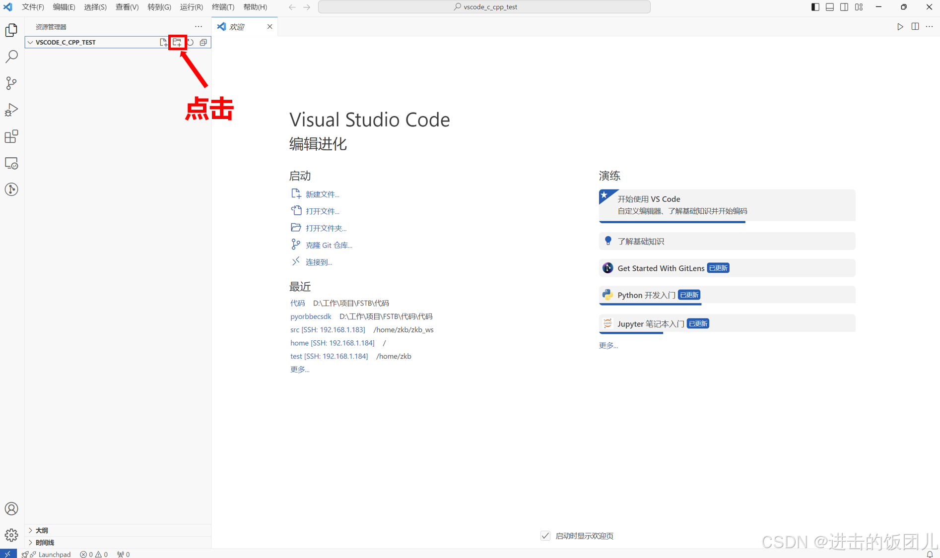 在VS Code中打开创建的vscode_c_cpp_test文件夹。点击新建文件夹按钮,命名为.vscode(这个名称不能修改)。