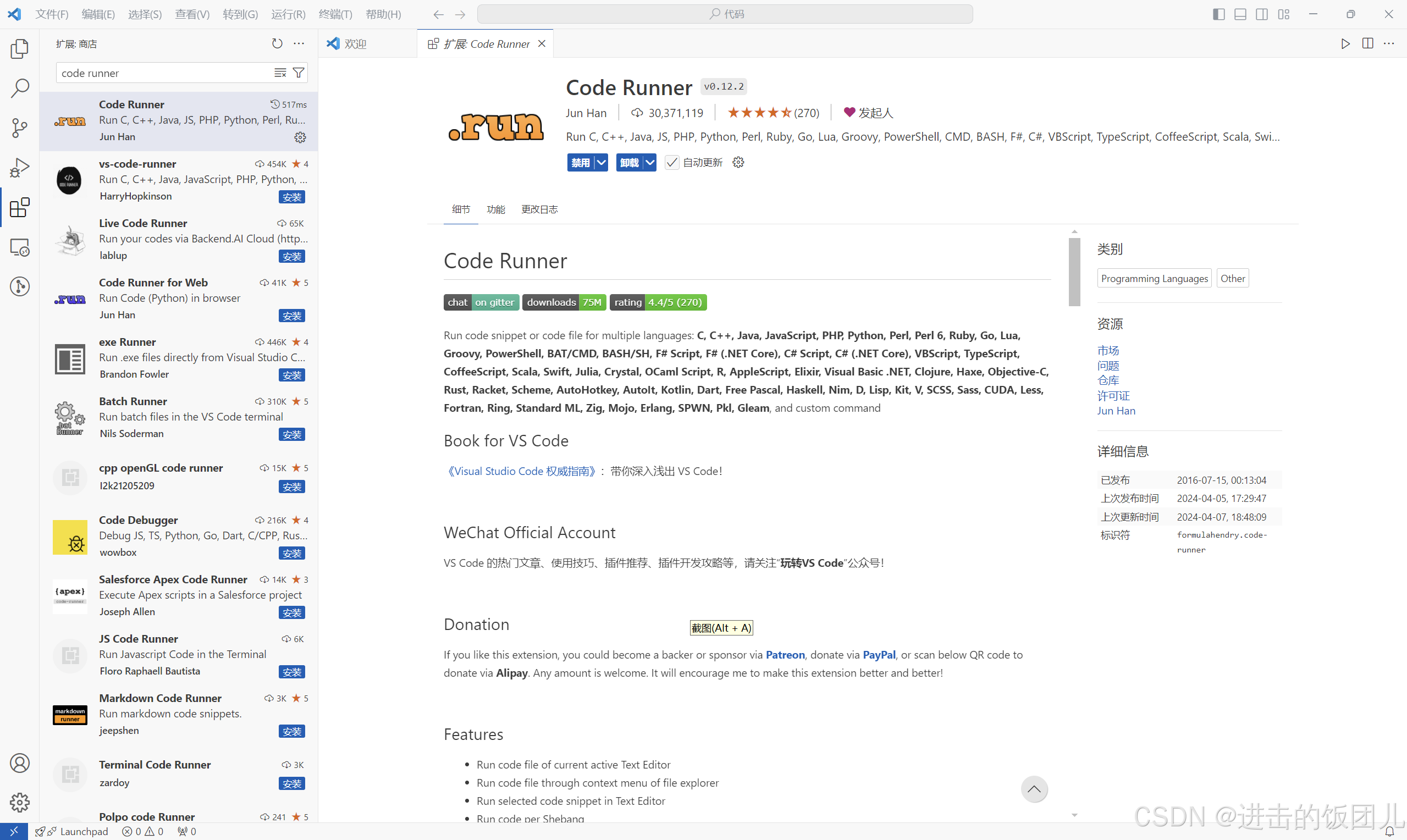 在搜索栏中搜索code runner,安装code runner插件。该插件可以让开发者快速运行多种编程语言的代码,而无需配置复杂的任务或调试环境。