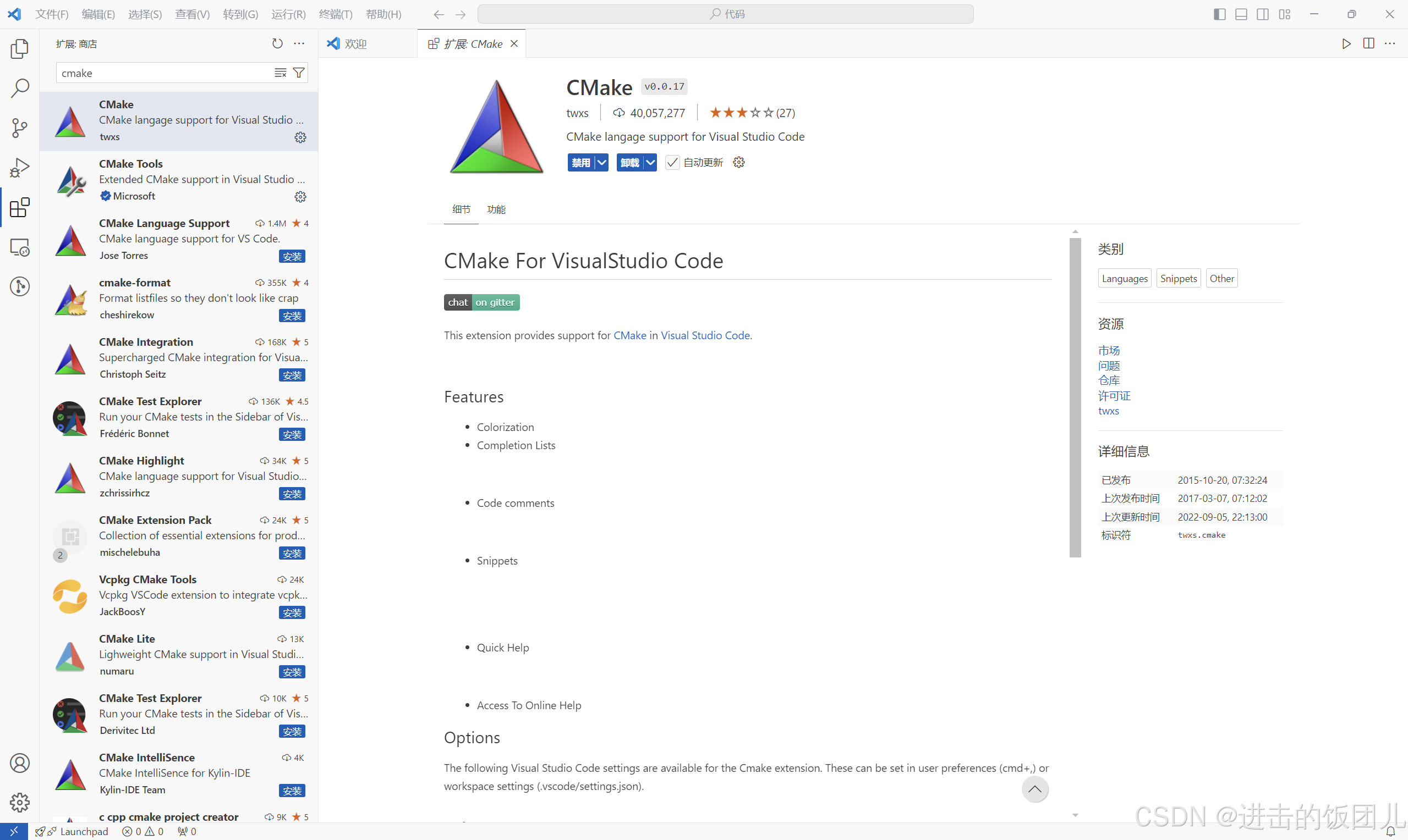 在搜索栏中搜索Cmake,安装c/c++ Extension Pack插件。该插件专门为使用CMake构建系统的开发者设计。它提供了丰富的功能,可以帮助开发者更高效地配置、生成、构建和调试基于CMake的项目。