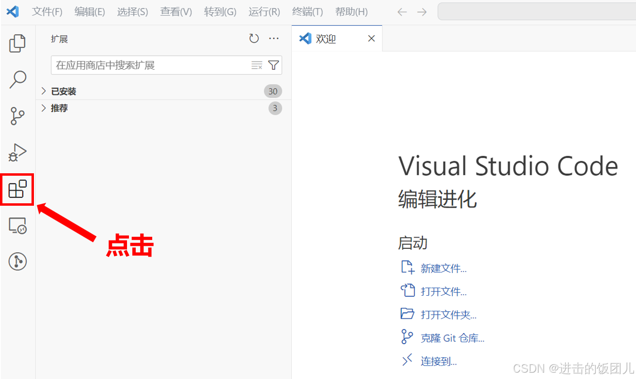 打开VS Code软件 ,在左侧点击插件管理按钮。