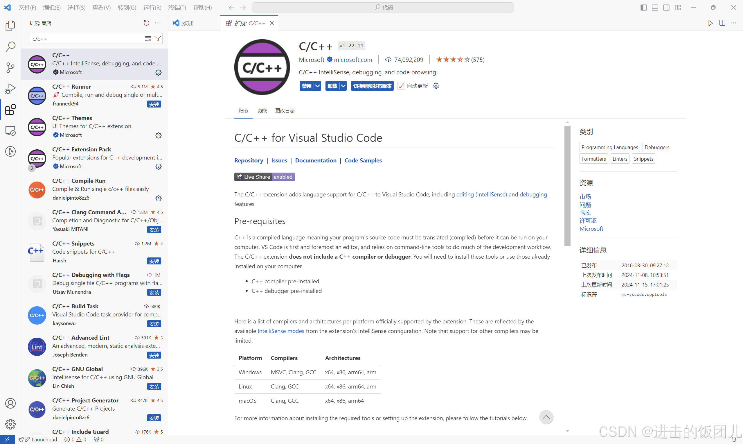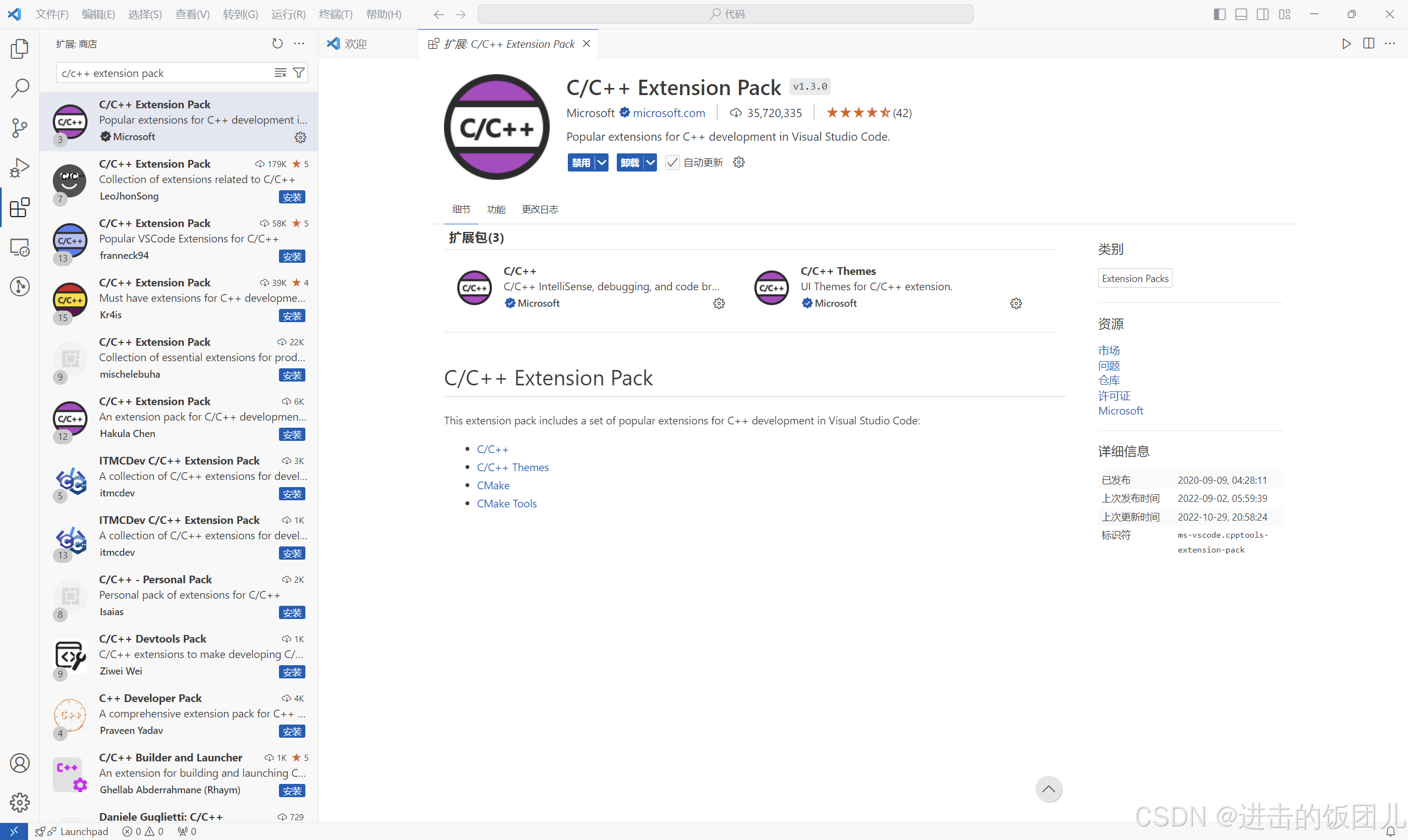 在搜索栏中搜索c/c++ Extension Pack,安装c/c++ Extension Pack插件。该插件由多个与C/C++开发相关的插件组成,帮助开发者更高效地在VS Code中进行代码编辑、调试、构建和测试工作。