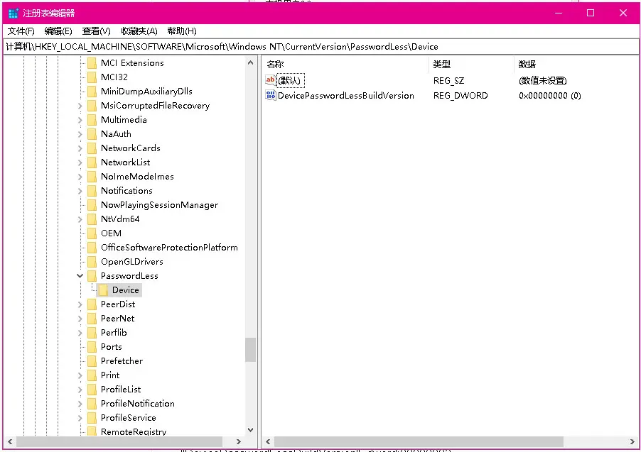 [HKEY_LOCAL_MACHINE\SOFTWARE\Microsoft\Windows NT\CurrentVersion\PasswordLess\Device];